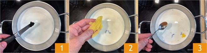Um die glutenfreie Vanillecreme zuzubereiten, gießen Sie zunächst die Milch in einen Topf, fügen Sie die Vanillesamen 1, die Zitronenschale 2 und den Zimt 3 hinzu. Rühren Sie um und bringen Sie es zum Kochen.