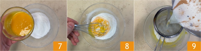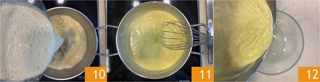 Fügen Sie nun die Eigelbe 7 hinzu und rühren Sie sofort um 8, um die Bildung von Klumpen zu vermeiden. Sobald die Milch den Siedepunkt erreicht hat, gießen Sie sie durch ein Sieb in die Schüssel 9, um die Zitronenschale herauszufiltern.