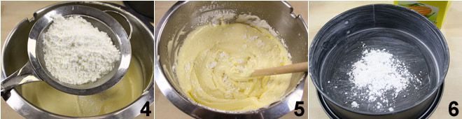 Nun können Sie die Maisstärke (oder Kartoffelstärke), die Sie vorher gut gesiebt haben, hinzufügen 4: Mischen Sie alles mit einem Holzlöffel, bis Sie eine homogene Masse erhalten, und achten Sie darauf, sie nicht zu entleeren 5.