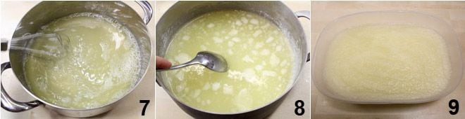 und mischen Sie die Mischung gut mit einem Schneebesen 7. An diesem Punkt stellen Sie die Zitronengranita ohne Eismaschine in einen (abgedeckten) Kunststoff- oder Metallbehälter in den Gefrierschrank. Nach einer halben Stunde nehmen Sie die Mischung aus dem Gefrierschrank und rühren sie kräftig um, um die Eiskristalle zu brechen, die sich gebildet haben 8. Wiederholen Sie diesen Vorgang alle halbe Stunde (oder alle Viertelstunde, wenn Sie sehen, dass die Mischung schneller fest wird) zwei- bis dreimal, bis Sie die Zitronengranita ohne Eismaschine in der gewünschten Konsistenz erhalten 9.