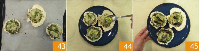 Würzen Sie sie mit dem gewürzten Petersilienöl 46, vervollständigen Sie sie mit Limettenschale 47 und servieren Sie die gratinierten Jakobsmuscheln mit Auberginen noch warm 48!