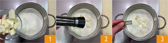 Zur Zubereitung der überbackenen römischen Gnocchi geben Sie zuerst die Milch in einen Topf, fügen Sie die Butter hinzu 1, salzen und pfeffern Sie 2 und würzen Sie mit Muskatnuss 3.