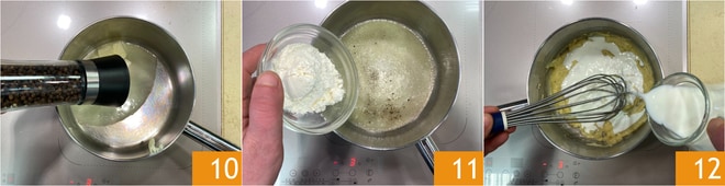 In der Zwischenzeit bereiten Sie die Béchamelsoße zu: In einem Topf geben Sie die Butter, salzen und pfeffern Sie 10 und lassen Sie sie bei schwacher Hitze schmelzen. Fügen Sie das Mehl auf einmal hinzu 11 und rühren Sie kräftig, um Klümpchen zu vermeiden. Sobald Sie die Mehlschwitze haben, verdünnen Sie sie mit der Milch, die Sie separat erwärmt haben, indem Sie sie nach und nach hinzufügen und ständig rühren 12.