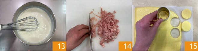 Rühren Sie bei schwacher Hitze für 5-6 Minuten, bis die gewünschte Konsistenz erreicht ist 13. Stellen Sie die Béchamelsoße beiseite und schneiden Sie den gekochten Schinken in Stücke 14. Nehmen Sie die Grießmasse und stechen Sie mit einem Ausstecher 5 cm große Kreise aus 15.
