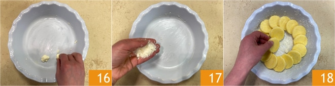 Fetten Sie zwei Auflaufformen von 20 cm Durchmesser ein 16 und bestreuen Sie den Boden mit geriebenem Parmesan 17. Legen Sie die Gnocchi im Kreis an, indem Sie sie leicht überlappen, vom äußeren Rand bis zur Mitte 18.