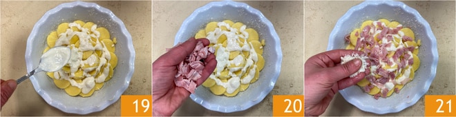 Bedecken Sie die Gnocchi mit der Béchamelsoße 19, verteilen Sie dann den gekochten Schinken 20 und beenden Sie mit weiterem geriebenen Parmesan 21.