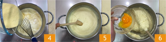 Bringen Sie die Mischung zum Kochen und geben Sie den Grieß unter ständigem Rühren mit einem Schneebesen hinzu, um Klümpchenbildung zu vermeiden 4. Kochen Sie auf niedriger Flamme für einige Minuten, bis die Mischung eingedickt ist 5. Wenn sich die Masse vom Boden des Topfes zu lösen beginnt, nehmen Sie sie vom Herd, fügen Sie die Eigelbe hinzu 6 und rühren Sie gut um.