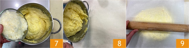 Fügen Sie auch den geriebenen Parmesan in mehreren Schritten hinzu 7 und rühren Sie, um ihn zu integrieren. Übertragen Sie die Masse auf ein Blatt Backpapier 8, decken Sie es mit einem weiteren Blatt Backpapier ab und rollen Sie es mit einem Nudelholz auf eine Dicke von 1 cm aus 9. Lassen Sie es vollständig auskühlen.
