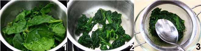 Um die grünen Nudeln mit Spinat zuzubereiten, geben Sie 60 g gewaschenen und abgetropften Spinat 1 in einen kleinen Topf, zusammen mit 2 Esslöffeln Wasser und einer Prise Salz. Decken Sie den Topf mit einem Deckel ab und lassen Sie den Spinat kochen und trocknen 2, dann sieben Sie ihn durch ein Sieb 3.