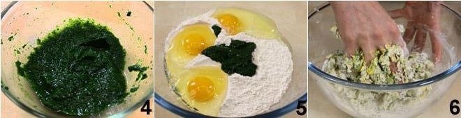 um eine glatte Creme zu erhalten 4. In einer Schüssel geben Sie das gesiebte Mehl, die Eier (die Sie auf Raumtemperatur gebracht haben) und die Spinatcreme 5 hinzu und vermischen Sie die Zutaten gut 6.