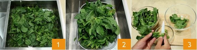 Um die grünen Omelett-Tagliatelle mit Pilzen und Speck zuzubereiten, beginnen Sie damit, den Spinat sorgfältig unter fließendem Wasser zu waschen 2, um eventuelle Erdreste zu entfernen. Lassen Sie ihn abtropfen 2 und schneiden Sie jeden Bund ab, indem Sie den Stiel entfernen 3.