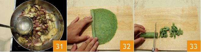 Wenn die Pilze und der Speck dazu neigen, zu sehr auszutrocknen, können Sie eine Kelle heißes Wasser oder Gemüsebrühe hinzufügen 31. Schalten Sie dann die Hitze aus und stellen Sie die Würzung für einen Moment beiseite. Gehen Sie zur Herstellung der Omelett-Tagliatelle über: Legen Sie auf einem Schneidebrett jedes Omelett aus und rollen Sie es auf sich selbst 32. Dann schneiden Sie es in etwa 1 cm breite Streifen 33.