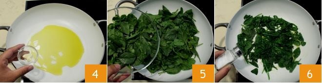 Geben Sie in eine große Pfanne einen Schuss Öl und die geschälte Knoblauchzehe 4. Braten Sie ihn an, entfernen Sie ihn dann und fügen Sie den Spinat hinzu 5. Lassen Sie ihn einige Minuten zusammenfallen und salzen Sie 6. Schalten Sie die Hitze aus, wenn er weich geworden und in Volumen reduziert ist.
