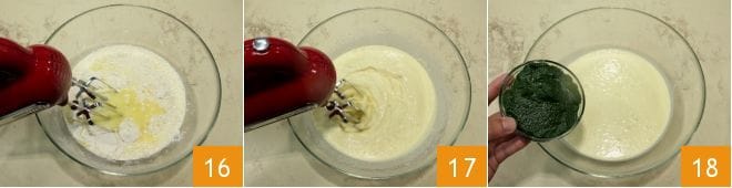 Arbeiten Sie die Mischung mit einem elektrischen Mixer 16 oder einem Schneebesen, bis Sie eine glatte und homogene Creme erhalten 17. Geben Sie dann auch die Spinatcreme in den Teig 18.