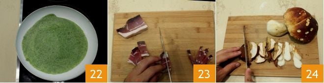 Kochen Sie die Crêpe etwa 1 Minute lang oder bis die Seite, die auf dem Pfannenboden aufliegt, leicht goldbraun ist; während des Kochens schütteln Sie die Pfanne von Zeit zu Zeit, damit sich die Crêpe vom Boden löst. Dann wenden Sie sie auf die andere Seite 22 und kochen sie eine weitere Minute. Verarbeiten Sie so weiter, bis der Teig aufgebraucht ist. Sie können die Crêpes nach und nach auf einen flachen Teller stapeln und mit Frischhaltefolie abdecken, während Sie mit der Zubereitung fortfahren. Gehen Sie dann zur Würzung über: Legen Sie den Speck auf ein Schneidebrett, schneiden Sie ihn in Scheiben und dann in etwa 0,5 cm breite Streifen und legen Sie ihn beiseite 23. Dann reinigen Sie die Steinpilze, indem Sie den Schmutz vorsichtig vom Stiel mit einem kleinen Messer abkratzen und anschließend mit einem Küchenpinsel und einem Tuch auch den Hut reinigen (für diese Schritte können Sie die Kochschule konsultieren:Wie man Steinpilze putzt). Schneiden Sie die Pilze dann in 0,5 cm dicke Scheiben 24.