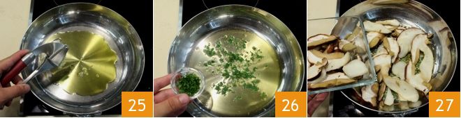 Geben Sie in eine große Pfanne einen Schuss Öl und hacken Sie eine Knoblauchzehe 25. Fügen Sie auch die vorher gehackte Petersilie hinzu 26 und braten Sie sie kurz an. Dann fügen Sie die Pilze hinzu 27