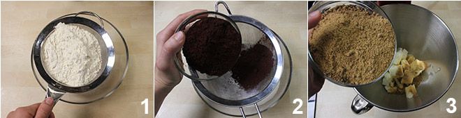 Um den Guinness-Schokoladenkuchen vorzubereiten, sieben Sie das Mehl zusammen mit dem Backpulver und dem ungesüßten Kakao in eine Schüssel (1-2). Geben Sie dann die weiche Butter und den dunklen braunen Zucker in eine Schüssel 3 und vermengen Sie die Zutaten mit einer Küchenmaschine oder einem elektrischen Mixer, um alles zu einer Creme zu verarbeiten.
