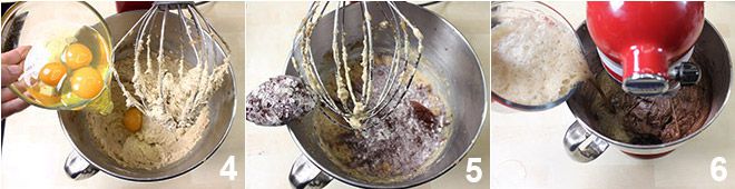 Fügen Sie die Eier nacheinander hinzu 4 und mischen Sie weiter, bis sie gut in die Mischung integriert sind. Fügen Sie nach und nach die trockenen Zutaten hinzu 5, bis Sie einen homogenen und cremigen Teig erhalten. Zum Schluss fügen Sie das Guinness-Bier in einem dünnen Strahl hinzu 6 und rühren um.