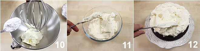 Bereiten Sie inzwischen die Creme für die Abdeckung vor: Mischen Sie den Mascarpone mit dem Philadelphia und dem Puderzucker 10 und arbeiten Sie die Zutaten mit einem Schneebesen zu einer weichen und dichten Creme 11. Verteilen Sie die Creme auf dem Kuchen und formen Sie kleine Häufchen, die an den Schaum von Guinness-Bier erinnern. Ihr Guinness-Schokoladenkuchen ist servierbereit!