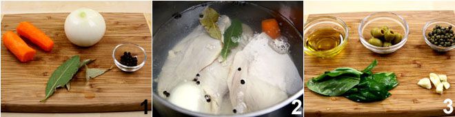 Um das Hähnchen in grüner Soße zuzubereiten, beginnen Sie damit, eine Zwiebel zu schälen und eine Karotte zu schälen und in zwei Hälften zu schneiden 1. Legen Sie sie in ca. 1,5 Liter Wasser und fügen Sie die Lorbeerblätter und Pfefferkörner hinzu. Salzen und zum Kochen bringen. Reduzieren Sie die Hitze und geben Sie die Hähnchenbrust zum Garen hinein 2. Sie sollten je nach Dicke des Fleisches zwischen 10 und 20 Minuten kochen, bis es vollständig weiß, aber noch ziemlich zart ist. In der Zwischenzeit bereiten Sie die Soße zu. Zerkleinern Sie die Oliven, Kapern, Basilikum, Knoblauch und Petersilie in einem Mixer 3.