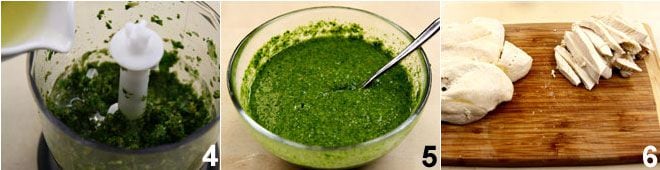 Fügen Sie 3 Esslöffel Öl und einen Spritzer Zitronensaft hinzu und vermischen Sie alles 4. Schmecken Sie eventuell mit Salz ab und wenn die grüne Soße zu dick ist, fügen Sie nach Belieben etwas Öl, etwas Zitronensaft oder etwas Wasser hinzu 5. Lassen Sie dann die Hähnchenbrust abtropfen (Sie können die Brühe für andere Gerichte aufbewahren), lassen Sie sie abkühlen und schneiden Sie sie in gleichmäßige Streifen 6.