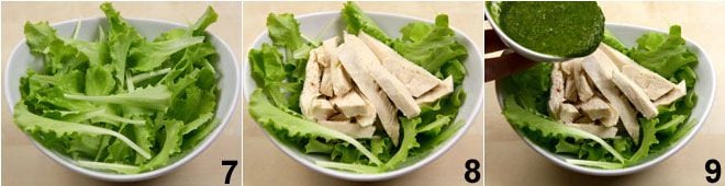 Geben Sie Salat in eine Schüssel 7, fügen Sie die Hähnchenbruststreifen hinzu 8 und würzen Sie sie mit der erhaltenen grünen Soße 9. Das Hähnchen in grüner Soße kann auch mit gekochten Kartoffeln serviert werden.