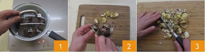 Um das gefüllte Hähnchen in Fruchtsauce zuzubereiten, beginnen Sie mit den Kastanien. Kochen Sie sie etwa 30 Minuten lang mit Deckel 1 und sobald sie gekocht sind, schälen und häuten Sie sie 2 und zerkleinern Sie nur 50 Gramm davon, während Sie die restlichen ganz lassen können 3.