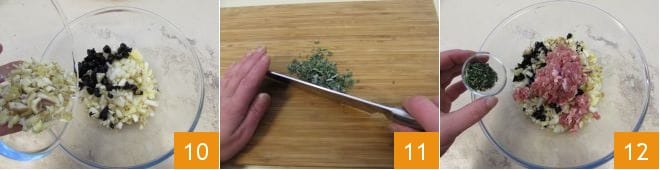 dann die Pflaumen und die Kastanien 10. Zerkleinern Sie dann das Lorbeerblatt, die Salbeiblätter und die Rosmarinnadeln 11 und fügen Sie sie der Mischung zusammen mit den Würstchen hinzu, wobei Sie darauf achten, etwas von der Kräutermischung aufzubewahren, um die Oberfläche der Hähnchen zu massieren 12.
