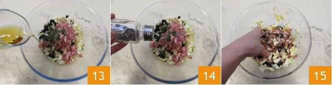 Gießen Sie schließlich den Brandy 13 hinzu, würzen Sie mit Salz und Pfeffer 14 und vermengen Sie alles gut mit den Händen oder einem Löffel, wenn Sie es vorziehen 15, und bewahren Sie die Mischung auf, die dann zum Füllen verwendet wird.