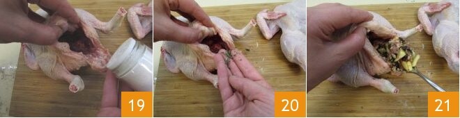 Salzen und pfeffern Sie die Oberfläche und das Innere der Hähnchen 19, fügen Sie etwas von der Kräutermischung hinzu 20 und füllen Sie sie mit der zuvor zubereiteten Füllung 21.