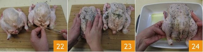 Schließen Sie die Hähnchen mit Küchengarn, damit die Füllung nicht herausläuft 22 und massieren Sie sie sanft, indem Sie die restliche Kräutermischung darüber streuen 23, damit die Aromen gut an der Haut haften. Legen Sie die Hähnchen in eine nicht zu große Auflaufform, in die Sie etwas Olivenöl extra vergine gegossen haben 24