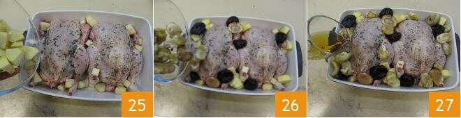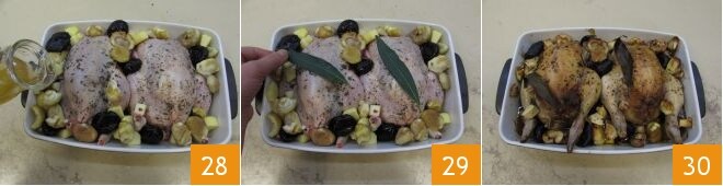 und die Brühe 28 und die Lorbeerblätter, die Sie auf der Oberfläche der Hähnchen anordnen 29. Backen Sie sie bei 200°C etwa 80 Minuten, wobei Sie darauf achten, die Oberfläche hin und wieder mit der Garflüssigkeit zu begießen, damit die Zutaten nicht anbrennen. Wenn sie fertig gegart sind, können Sie das gefüllte Hähnchen in Fruchtsauce noch heiß servieren 30.