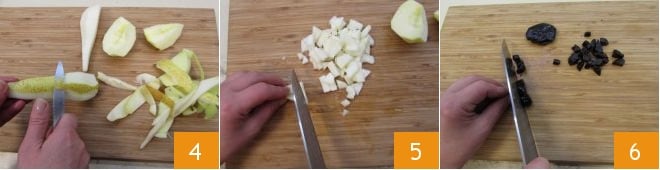 Schälen Sie den Apfel und die Birne 4 und schneiden Sie sie in Würfel 5. Dann zerkleinern Sie auch 50 Gramm Pflaumen, die Sie etwa zehn Minuten in warmem Wasser einweichen können, wenn sie zu trocken sind 6.