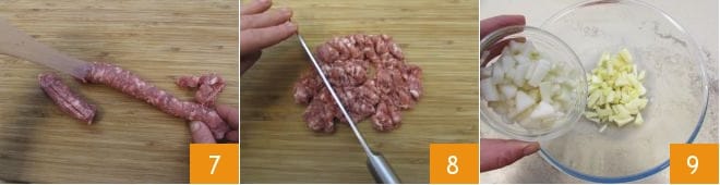 Entfernen Sie schließlich das Darm von den Würstchen 7 und zerbröseln Sie diese ebenfalls 8. Geben Sie nun in eine größere Schüssel 100 Gramm Apfelwürfel und 150 Gramm Birnenwürfel 9,
