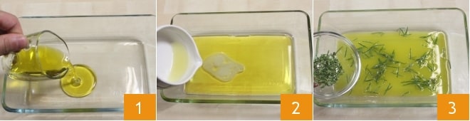 Um die Hähnchenbrust mit Balsamico-Essig zuzubereiten, beginnen Sie mit der Marinade: Geben Sie das Olivenöl in eine Schüssel 1, dann pressen Sie den Saft einer halben Zitrone aus, filtern ihn durch ein feines Sieb und fügen ihn zum Öl in der Schüssel hinzu 2. Emulgieren Sie dann die Zutaten sorgfältig mit einem Schneebesen oder einer Gabel. Fügen Sie dann die Kräuter hinzu: die Rosmarinzweige, den Thymian 3
