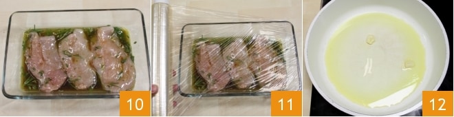 und befeuchten Sie sie gut. Wenden Sie die Scheiben, um sie auch von der anderen Seite zu marinieren 10, dann decken Sie sie mit Frischhaltefolie ab 11 und stellen Sie sie für mindestens eine Stunde in den Kühlschrank. Nach der erforderlichen Zeit nehmen Sie eine große Pfanne und geben Sie einen Schuss Öl darin. Braten Sie eine Knoblauchzehe an 12 und entfernen Sie sie, wenn sie goldbraun ist.