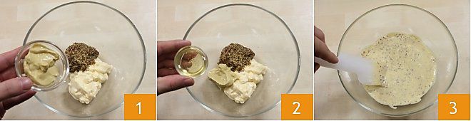 Um die Hähnchenstäbchen mit Senfsauce vorzubereiten, beginnen Sie mit der Sauce: Geben Sie zuerst den Dijon-Senf zur Mayonnaise, dann den milden Senf 1 und schließlich den Honig 2. Rühren Sie mit einem Spatel oder Löffel, bis eine homogene Mischung entsteht 3 und decken Sie die Schüssel mit Frischhaltefolie ab. Stellen Sie die Schüssel dann in den Kühlschrank.