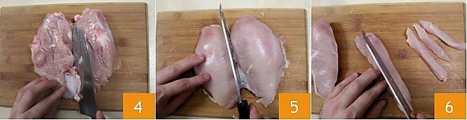 Reinigen Sie die Hähnchenbrust mit einem Messer von eventuellem Fett oder inneren Knorpeln 4, legen Sie sie mit der Innenseite nach unten auf das Schneidebrett 5, und schneiden Sie sie dann in 1,5 cm dicke Scheiben, die Sie in quadratische Streifen schneiden 6.