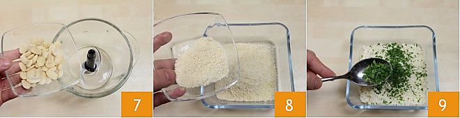 Hack Sie die Mandeln grob mit einem Zerkleinerer 7. In einer Schüssel fügen Sie zu den gehackten Mandeln das Paniermehl, den geriebenen Käse 8, den Pfeffer und den gehackten Petersilie hinzu 9.
