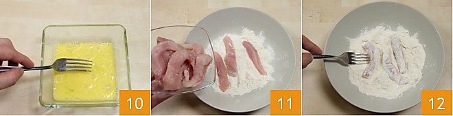 In einer separaten Schüssel verquirlen Sie die Eier mit einer Gabel und fügen Sie Salz hinzu 10. In eine andere Schüssel geben Sie das Mehl. Wenden Sie die Hähnchenstäbchen im Mehl 11, bis sie vollständig bedeckt sind 12.