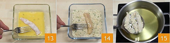 Sobald sie bemehlt sind, tauchen Sie sie in das verquirlte Ei 13 und dann in die Panade 14. Erhitzen Sie in einem Topf das Öl für einige Minuten. Um zu überprüfen, ob es heiß genug ist, lassen Sie ein wenig Paniermehl hineinfallen; wenn es zischt, tauchen Sie die Stäbchen hinein 15.
