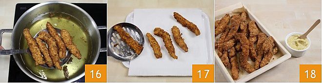 Braten Sie die Hähnchenstäbchen, bis sie schön goldbraun sind 16. Alternativ können Sie die Hähnchenstäbchen auch im Ofen zubereiten, indem Sie sie 5 Minuten bei 250°C im statischen Ofen (4 Minuten bei 230°C im Umluftofen) backen und die Garzeit mit 5 Minuten Grill beenden. Legen Sie die gebratenen Stäbchen auf ein mit saugfähigem Papier ausgelegtes Tablett 17. Nehmen Sie die Sauce aus dem Kühlschrank und geben Sie sie in eine kleine Schale, und schon sind Ihre Hähnchenstäbchen mit Senfsauce bereit zum Genießen 18.