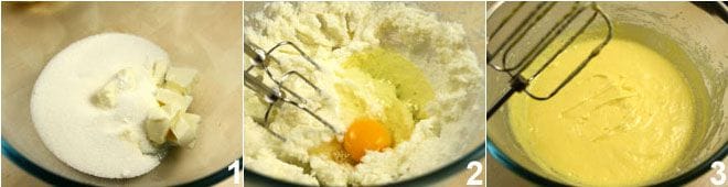 Um den Harlekin-Kuchen zuzubereiten, geben Sie Zucker, die Samen der Vanilleschote und die weiche Butter 1 in eine Schüssel und verwenden Sie einen elektrischen Handmixer. Fügen Sie die Eier 2 nacheinander bei Raumtemperatur hinzu, bis sie eine cremige Konsistenz erreichen 3.