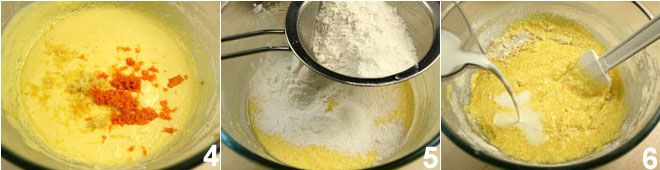 Rühren Sie weiter und fügen Sie die Zitronen- und Orangenschale 4 hinzu und vermischen Sie das Ganze. Geben Sie dann das gesiebte Mehl 5, das Backpulver und die Kartoffelstärke hinzu und rühren Sie gut um. Gießen Sie anschließend die Milch bei Raumtemperatur in den Teig 6.