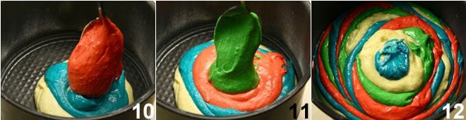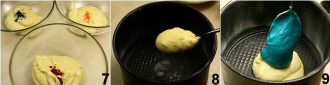Teilen Sie den entstandenen Teig gleichmäßig auf vier Schüsseln auf; lassen Sie eine mit dem natürlichen Teig und geben Sie in die anderen drei eine Messerspitze Lebensmittelfarbe 7 in unterschiedlichen Farben, vorzugsweise in Pulverform. Verwenden Sie zum Beispiel rote, blaue und gelbe Lebensmittelfarbe und mischen Sie die Pulver, um unterschiedliche Farben zu erzielen. Fetten und mehlen Sie eine 18 cm Springform mit hohen Rändern (eine Panettone-Form), geben Sie einen Esslöffel Teig in die Mitte 8, dann einen weiteren Esslöffel Teig einer anderen Farbe 9 darüber,
