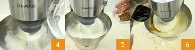 Fügen Sie 50 g Zucker hinzu 4, und sobald es weiß wird, fügen Sie das lösliche Kaffeepulver hinzu 5. Das Eiweiß muss bereits gut geschlagen sein, wenn der Sirup 121°C erreicht. Wenn der Sirup die oben angegebene Temperatur erreicht hat, gießen Sie ihn langsam in das Eiweiß 6, während Sie mit dem Schneebesen weiterschlagen, bis die Baisermasse vollständig abgekühlt ist.
