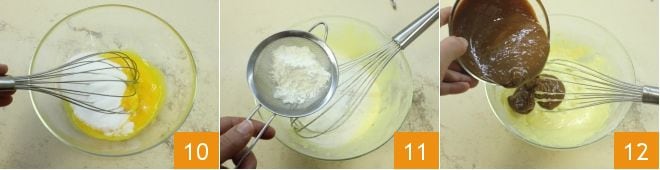 In der Zwischenzeit kümmern Sie sich um die Creme: Geben Sie die Eigelbe und den Zucker in eine Schüssel und schlagen Sie sie mit einem Schneebesen von Hand 10, bis Sie eine helle und schaumige Masse erhalten. Sieben Sie das Mehl und die Stärke direkt in die Schüssel 11, geben Sie die Haselnusspaste dazu 12 und rühren Sie weiterhin mit dem Schneebesen, um die Zutaten zu mischen.