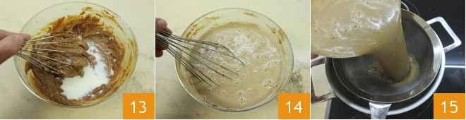 Zuletzt fügen Sie die Milch hinzu 13 und rühren, bis Sie eine homogene Creme erhalten 14. Gießen Sie die Creme durch ein Sieb in einen Topf, um eventuelle Klumpen zu entfernen 15