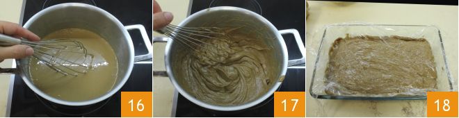 und bringen Sie sie bei mittlerer Hitze zum Kochen 16, setzen Sie das Kochen fort, bis Sie eine dichte und kompakte Creme erhalten 17, und rühren Sie dabei weiter mit dem Schneebesen. Geben Sie die erhaltene Creme in eine Auflaufform, bedecken Sie sie mit Frischhaltefolie, die direkt auf der Oberfläche der Masse aufliegt 18, lassen Sie sie abkühlen und legen Sie die Creme dann für mindestens eine Stunde in den Kühlschrank, um sie fest werden zu lassen.