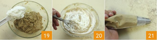 Nach der Kühlzeit fügen Sie 200 ml geschlagene Sahne zur Creme hinzu 19 und rühren mit einem Schneebesen 20; für weitere Details konsultieren Sie das Blatt Wie man Sahne schlägt. Geben Sie die Creme in einen Spritzbeutel mit Sterntülle 21 und bewahren Sie sie im Kühlschrank auf, bis Sie sie verwenden.
